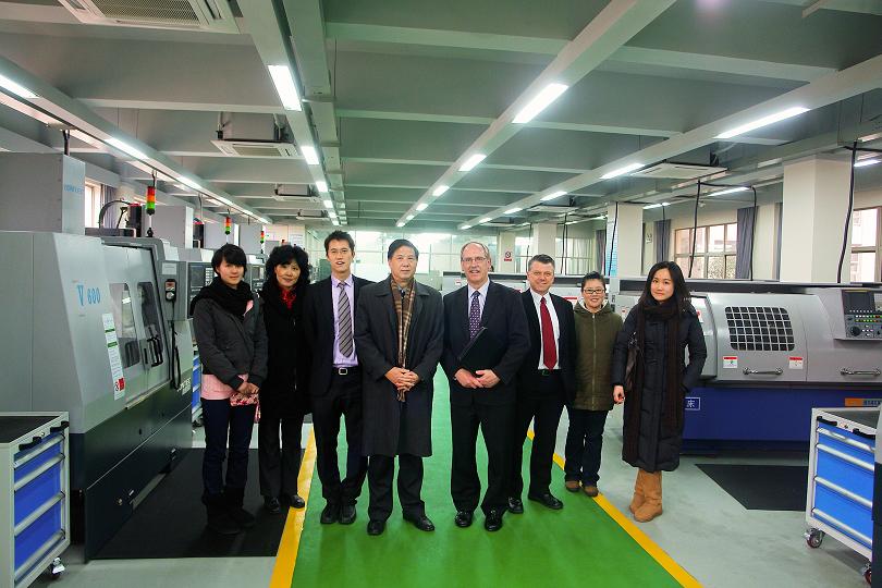 2012年2月23日, 加拿大Trinity Western 大學(xué)兩位副校長來我校做交流訪問。圖為院長杜飛龍、院長助理張沈、國際交流處長張佩莉等與來賓在我院數(shù)控實(shí)訓(xùn)中心合影留念