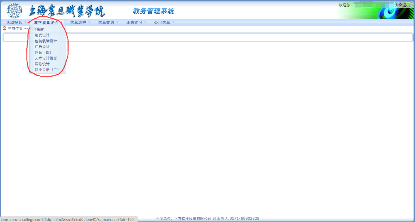 各院(部)、各年級(jí)輔導(dǎo)員: 為檢查本學(xué)期的教學(xué)情況、掌握課程教學(xué)進(jìn)展、了解教學(xué)效果、分析教學(xué)中所存在的問(wèn)題。決定以院(部)為單位,開展教學(xué)質(zhì)量評(píng)價(jià),現(xiàn)就本學(xué)期教學(xué)質(zhì)量評(píng)價(jià)事項(xiàng)通知如下: 一、工作要求和說(shuō)明 1.學(xué)院采用正方教務(wù)管理系統(tǒng)的教學(xué)質(zhì)量評(píng)價(jià)軟件處理信息,每個(gè)同學(xué)必須進(jìn)行網(wǎng)上評(píng)教,凡是不參加者,將無(wú)權(quán)限參加網(wǎng)上選課、查詢期末成績(jī)。 2.網(wǎng)上評(píng)教反映同學(xué)們對(duì)學(xué)院教學(xué)質(zhì)量提高的責(zé)任心、也是同學(xué)的權(quán)益,客觀、公正、自主是做好這項(xiàng)工作的基本要求。 二、網(wǎng)上評(píng)教界面及操作須知 1.登錄正方教學(xué)管理信息系統(tǒng)。在地址欄輸入http://tams.aurora-college.cn/(S(k2ywb4j0frbw1eyzgdf4mo45))/Default2.aspx,進(jìn)入用戶登錄界面。以學(xué)生賬號(hào)和密碼輸入,選擇“學(xué)生”角色登錄。 注:學(xué)生賬號(hào)統(tǒng)一為9位數(shù)學(xué)號(hào),2015級(jí)新生登錄密碼為本人身份證號(hào) 2.在網(wǎng)頁(yè)系統(tǒng)界面下,如圖1所示,選擇[教學(xué)質(zhì)量評(píng)價(jià)]菜單下的被評(píng)價(jià)課程。 圖1 3.在圖2所示的評(píng)價(jià)等級(jí)欄下,選擇你對(duì)教師的課程評(píng)價(jià)并保存。 圖2 4.再次選擇被評(píng)價(jià)課程和評(píng)價(jià)等級(jí),評(píng)完所有課程后單擊提交。 圖3 5.注意事項(xiàng) (1)在教學(xué)評(píng)價(jià)時(shí)每評(píng)價(jià)一門課程需要保存一次。 (2)評(píng)價(jià)分五個(gè)等級(jí),A為最高級(jí)。評(píng)價(jià)完所有課程后,單擊[提交],每評(píng)價(jià)一門課程,要保存一次 。 (3)評(píng)價(jià)完全部課程并且保存提交為有效,完成一次評(píng)教需時(shí)10-15分鐘。 教務(wù)處咨詢?nèi)藛T/電話:王欣/66866916