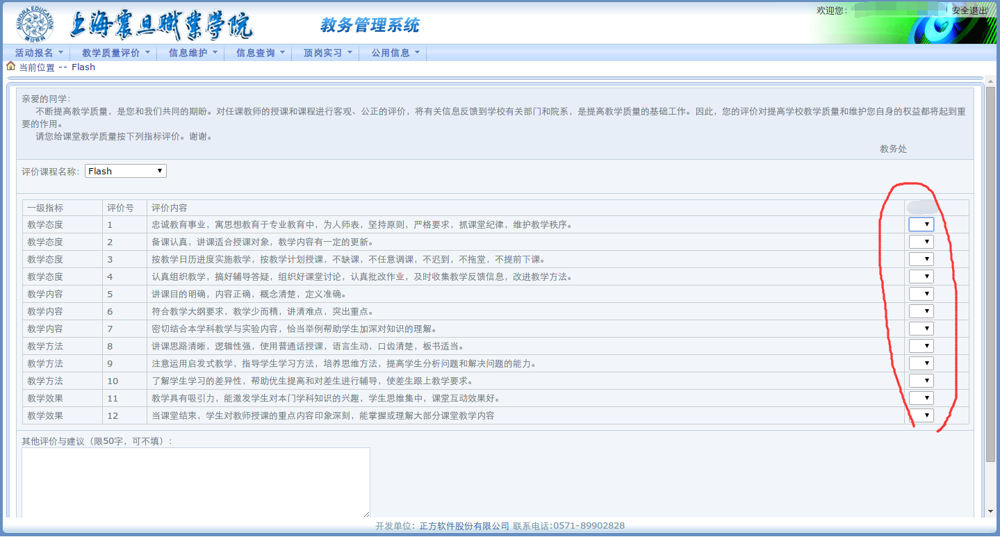 各位2015、2016級同學(xué): 為檢查我院本學(xué)期的教學(xué)情況、了解教學(xué)效果、分析教學(xué)中所存在的問題,決定開展2016-2017學(xué)年第二學(xué)期教學(xué)質(zhì)量評價,現(xiàn)就本學(xué)期教學(xué)質(zhì)量評價事項通知如下: 一、工作要求和說明 1.學(xué)院采用正方教務(wù)管理系統(tǒng)開展教學(xué)質(zhì)量評價,請每位同學(xué)按照時間節(jié)點進行網(wǎng)上評教。凡未參加者,查閱成績及網(wǎng)上選課權(quán)限將受到限制。 2.請同學(xué)客觀、公正的評價每位任課教師。 二、網(wǎng)上評教界面及操作須知 1.登錄正方教學(xué)管理信息系統(tǒng)。在地址欄輸入http://tams.aurora-college.cn/(S(k2ywb4j0frbw1eyzgdf4mo45))/Default2.aspx,進入用戶登錄界面。以學(xué)生賬號和密碼輸入,選擇“學(xué)生”角色登錄。 2.在網(wǎng)頁系統(tǒng)界面下,如圖1所示,選擇[教學(xué)質(zhì)量評價]菜單下的被評價課程。 圖1 3.在圖2所示的評價等級欄下,選擇你對教師的課程評價并保存。 圖2 4.再次選擇被評價課程和評價等級,評完所有課程后單擊提交。 5.注意事項 (1)本學(xué)期教學(xué)質(zhì)量評價的時間為: 4月19日——4月28日 (2)在教學(xué)評價時每評價一門課程需要保存一次。 (3)評價分五個等級,A為最高級,待評價完所有課程后,請單擊[提交]。 (4)如在評教過程中遇到問題,請咨詢教務(wù)處王老師,電話66866916