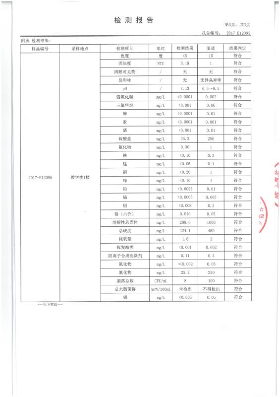 為了保障學(xué)校師生飲用水安全問題,由第三方檢測單位對我校飲用水按照國家生活飲用水衛(wèi)生標(biāo)準(zhǔn)進(jìn)行檢測,檢測項目多達(dá)30項,具體結(jié)果公布如下: