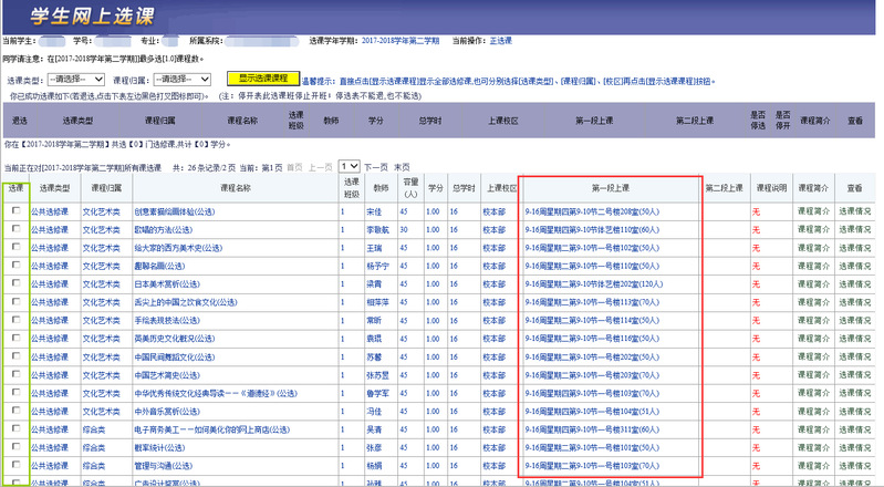 查看選修課的上課時段(紅框處),避免與日常課程沖突,點選左側(cè)框格(綠框處)以選中對應(yīng)課程,見圖3,