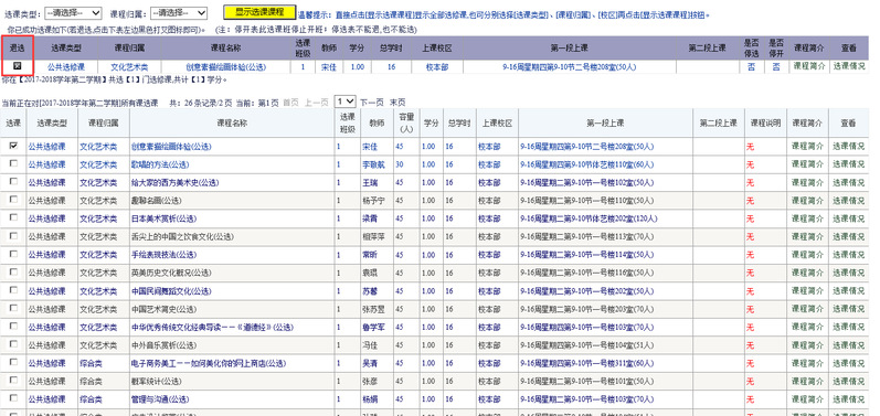 進入選課頁面后,點選【顯示選課課程】,本學(xué)期所開設(shè)的選修課將以列表形式呈現(xiàn),見圖2,