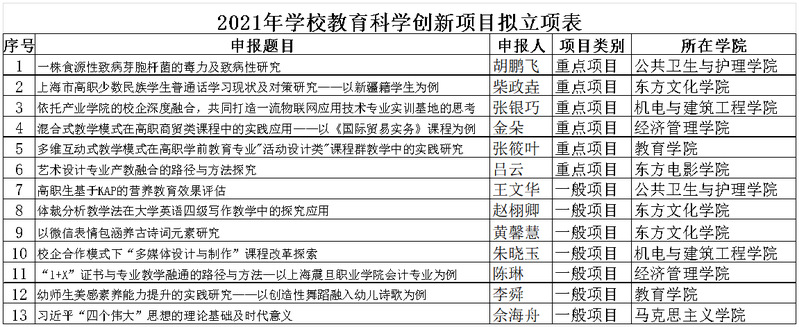 根據(jù)滬震院〔2020〕53號文《上海震旦職業(yè)學(xué)院校級科研創(chuàng)新項目管理辦法》,經(jīng)教師申報、學(xué)院審核、學(xué)校專家組答辯評審,擬立項以下13個項目為2021年上海震旦職業(yè)學(xué)院校級科研創(chuàng)新項目,現(xiàn)予以公示,如有異議,請于2021年11月4日前向?qū)W??茖W(xué)技術(shù)處張老師反映,聯(lián)系電話15692165576。