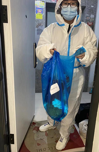 志愿者1:黃梅玲老師,為所在小區(qū)做物資配送志愿者服務(wù)。物資到小區(qū)門口后,進(jìn)行消殺,等待半個小時,再從小區(qū)門口運(yùn)送至每戶門洞樓下。志愿者2:王歡老師,主要負(fù)責(zé)在小區(qū)巡邏,讓居民做到足不出戶,下午在核酸排隊(duì)時拉警戒線,控制人流,督促居民們間隔一米,準(zhǔn)備好二維碼;其次負(fù)責(zé)物資的裝卸工作,并在晚上送到每一戶居民的家中。