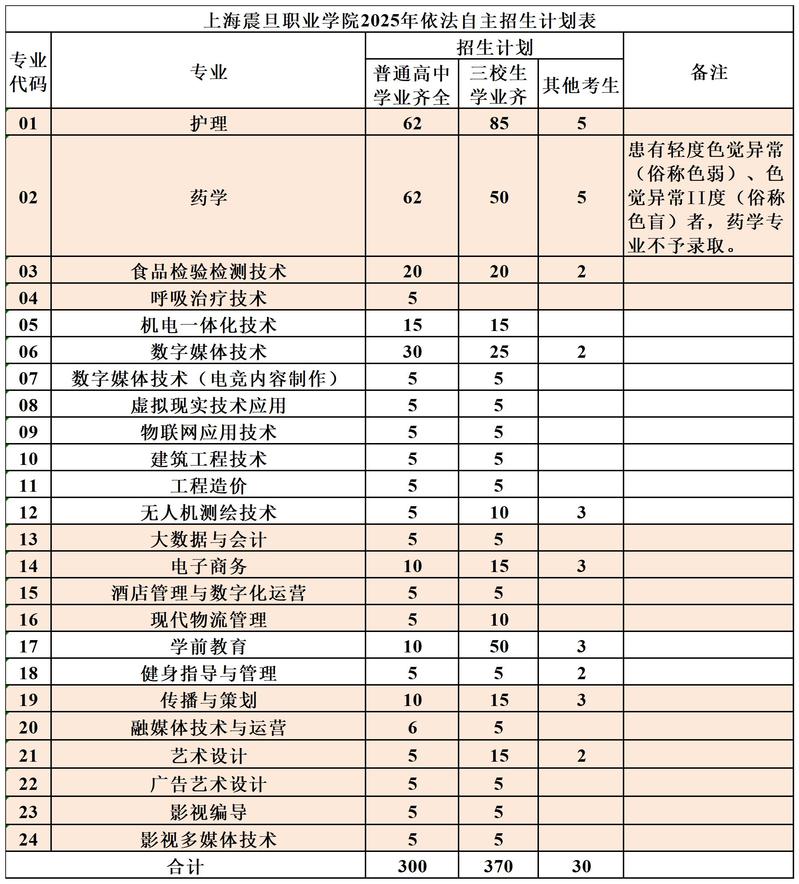 上海震旦職業(yè)學(xué)院2025年依法自主招生計(jì)劃表
