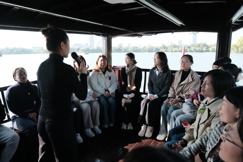 當日,黨員同志們乘坐Y701紅色專列奔赴嘉興,在會景園碼頭登船遠眺。在船上,教師黨支部書記高敏老師以“南湖的回響”為題,帶來了一場簡短而深刻的微黨課。她結(jié)合黨史故事與新時代使命,生動闡釋了“開天辟地、敢為人先的首創(chuàng)精神,堅定理想、百折不撓的奮斗精神,立黨為公、忠誠為民的奉獻精神”的核心內(nèi)涵。全體黨員圍坐船頭,沉浸式參與“水上課堂”,接受了一次深刻的思想淬煉。